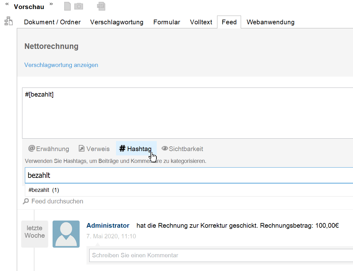 Bezahlte Rechnungen können einfach im Feed mit dem Hashtag #bezahlt markiert werden. So kann leicht erkannt werden, ob eine Rechnung schon bezahlt wurde. Dadurch wurde eine veraltete Lösung mit Kontrollkästchen ersetzt und eine simplere Lösung geschaffen. Mit Klick auf den Hashtag erhält man zudem eine Übersicht über alle bereits bezahlten Rechnungen.