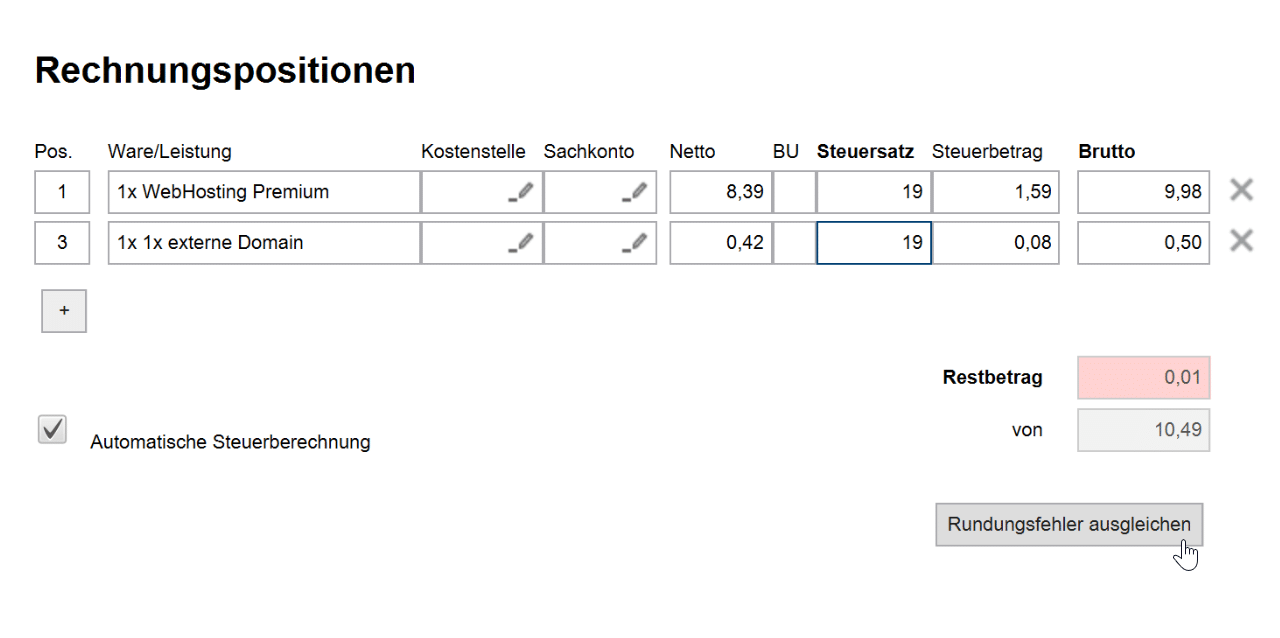 Sollten Ihre Rechnungspositionen aufgrund von Rundungsfehlern nicht aufgehen und um einige Cents vom Gesamtbruttobetrag abweichen, können Sie den neuen Button “Rundungsfehler ausgleichen” verwenden, damit der Restbetrag mit der letzten Rechnungsposition verrechnet wird. Das Aufgehen der Rechnungspositionen ist vor allem wichtig, wenn Sie Ihre Rechnung an DATEV übermitteln.