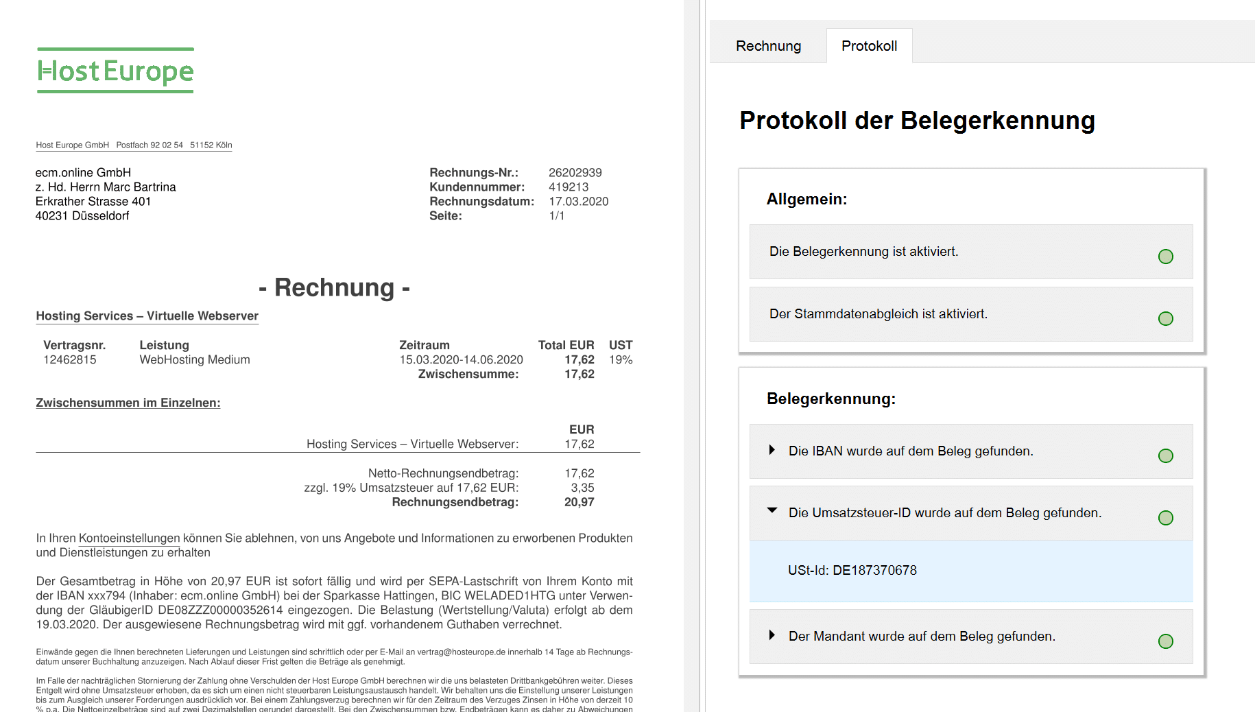 Das Protokoll wurde entwickelt, um den Vorgang der Texterkennung von Belegen und den Abgleich mit den Stammdaten transparent darzustellen. Es ermöglicht zu erkennen, welche Daten auf dem Beleg erkannt und welche Daten aus den Stammdaten abgerufen wurden.