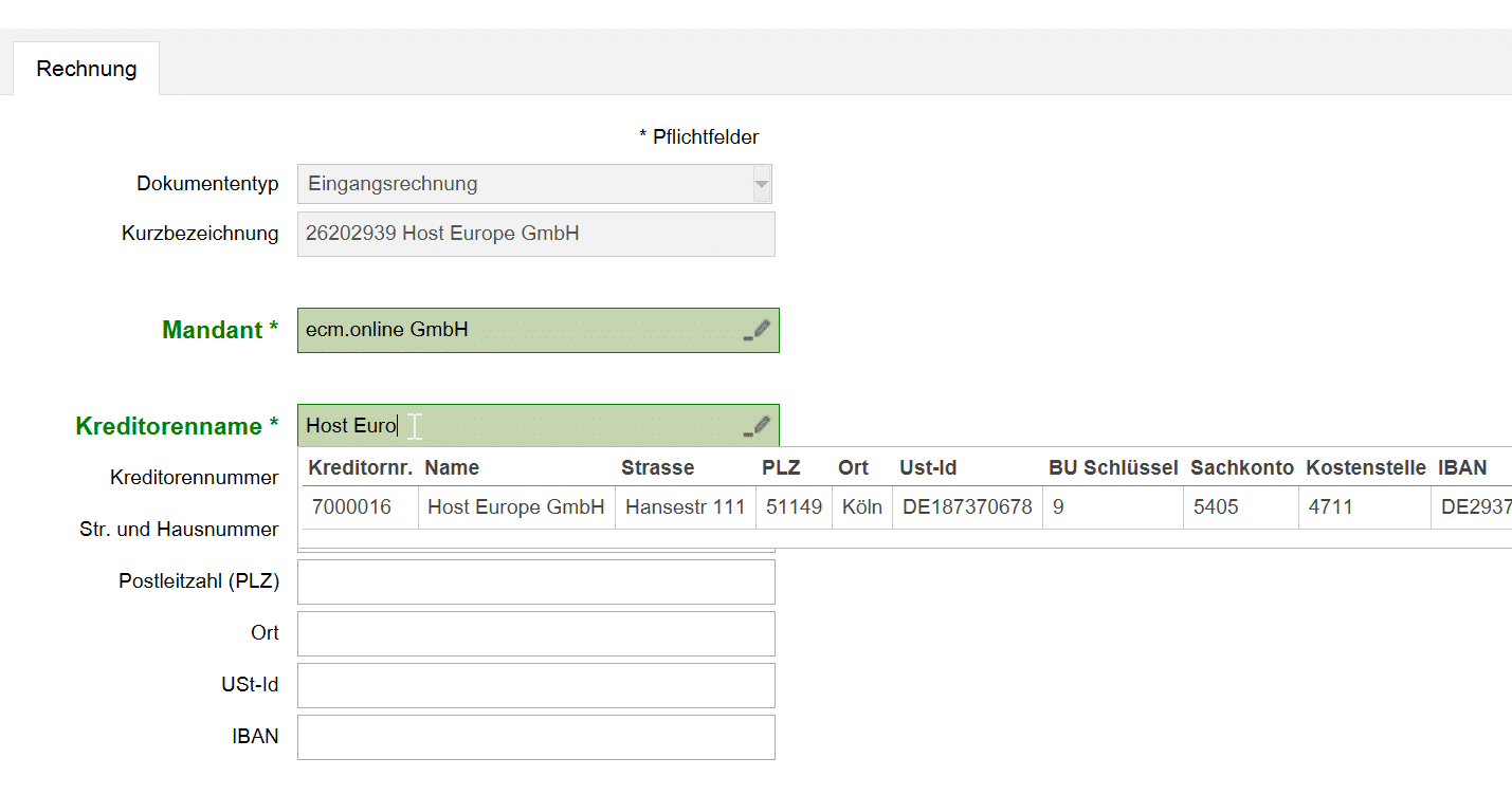 Um die Rechnungsdatenerfassung zu vereinfachen, können die Stammdaten Ihrer Kreditoren aus DATEV als .csv-Datei ins ELO importiert werden. Die Daten Ihrer Mandantschaft, geschäftlichen Kontakte sowie Kostenstellen und Sachkonten können bei der Erfassung von Rechnungsdaten leicht mittels Stichwortliste in das Formular eingefügt werden. Die Daten zu Ihren geschäftlichen Kontakte können auch im ELO über ein spezielles Formular angelegt oder während der Datenerfassung im Rechnungsformular erfasst werden.