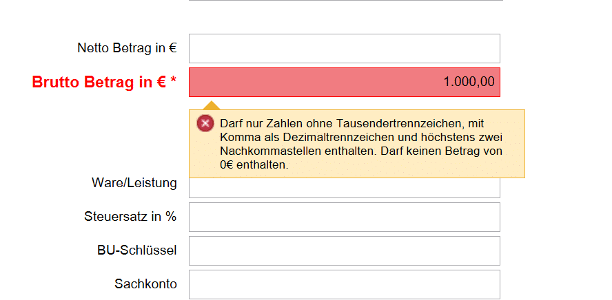 Die Überprüfungsfunktion ermöglicht eine unmittelbare Validierung der erfassten Rechnungsdaten und gewährleistet dadurch die korrekte Übermittlung der Rechnungsdaten nach DUO. Die Funktion überprüft die Formularfelder direkt bei der Eingabe auf die Einhaltung der Formatierungsrichtlinien von DATEV und beugt somit einer fehlerhaften Übermittlung vor. Bei ungültigen Eingaben wird neben farblichem Feedback auch darauf hingewiesen, welche Eingaben und Zeichen gültig sind. Das funktioniert zum Beispiel auch bei Eingaben, die mehr Zeichen beinhalten, als erlaubt ist.